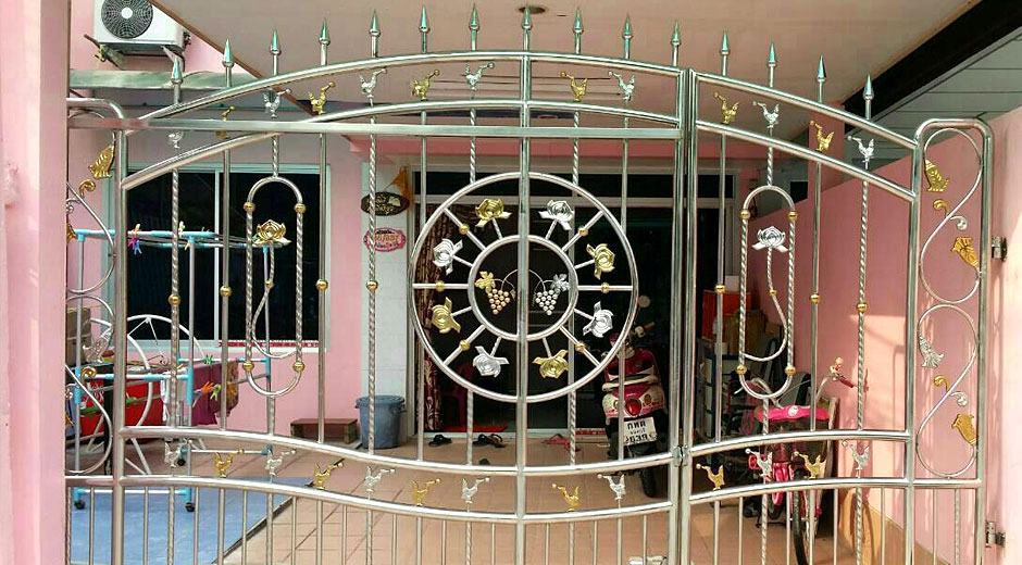 งานติดตั้ง ประตูรั้วสแตนเลส บ้านลูกค้า แถว สรงประภา ดอนเมือง วัสดุ ที่เลือกใช้ เป็น คริสตัล เกรด 304 ทรงโค้ง กรอบนอก ใช้สแตนเลส แบบกลม ขนาด 2 นิ้ว ความหนา 1.5 mm. ลวดลายข้างใน ใช้สแตนเลส 1 นิ้ว แบบเกลียว ความหนา 1.2 mm. บริเวณตรงกลาง เป็นรูปวงกลม ด้านข้าง ซ้าย ขวา เป็นรูปวงรี ตกแต่งเพิ่มเติม ด้วยตุ้มทอง ดอกกุหลาบ และ รูปหงษ์ สีทองเงิน ด้านบนประตู มีศรแหลม สแตนเลส เพิ่มความแข็งแรง และ ดูสวยงาม ขนาดประตู กว้าง 3.5 เมตร สูง 2.6 เมตร รวมพื้นที่ทั้งหมด ประมาณ 9.1 ตารางเมตร คิดค่าบริการ ตารางเมตรละ 5,500 บาท เบ็ดเสร็จแล้ว มีค่าบริการทั้งสิ้น ราวๆ 50,000 บาท แถมรับประกันผลงาน ยาวๆ อีก 1 ปี! สำหรับผู้ที่สนใจ สอบถามเพิ่มเติมได้ที่ โทร. 086-887-7219 หรือ 092-929-2589